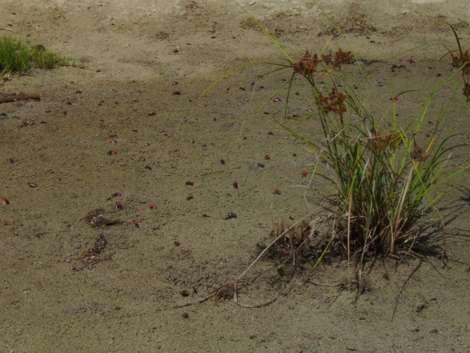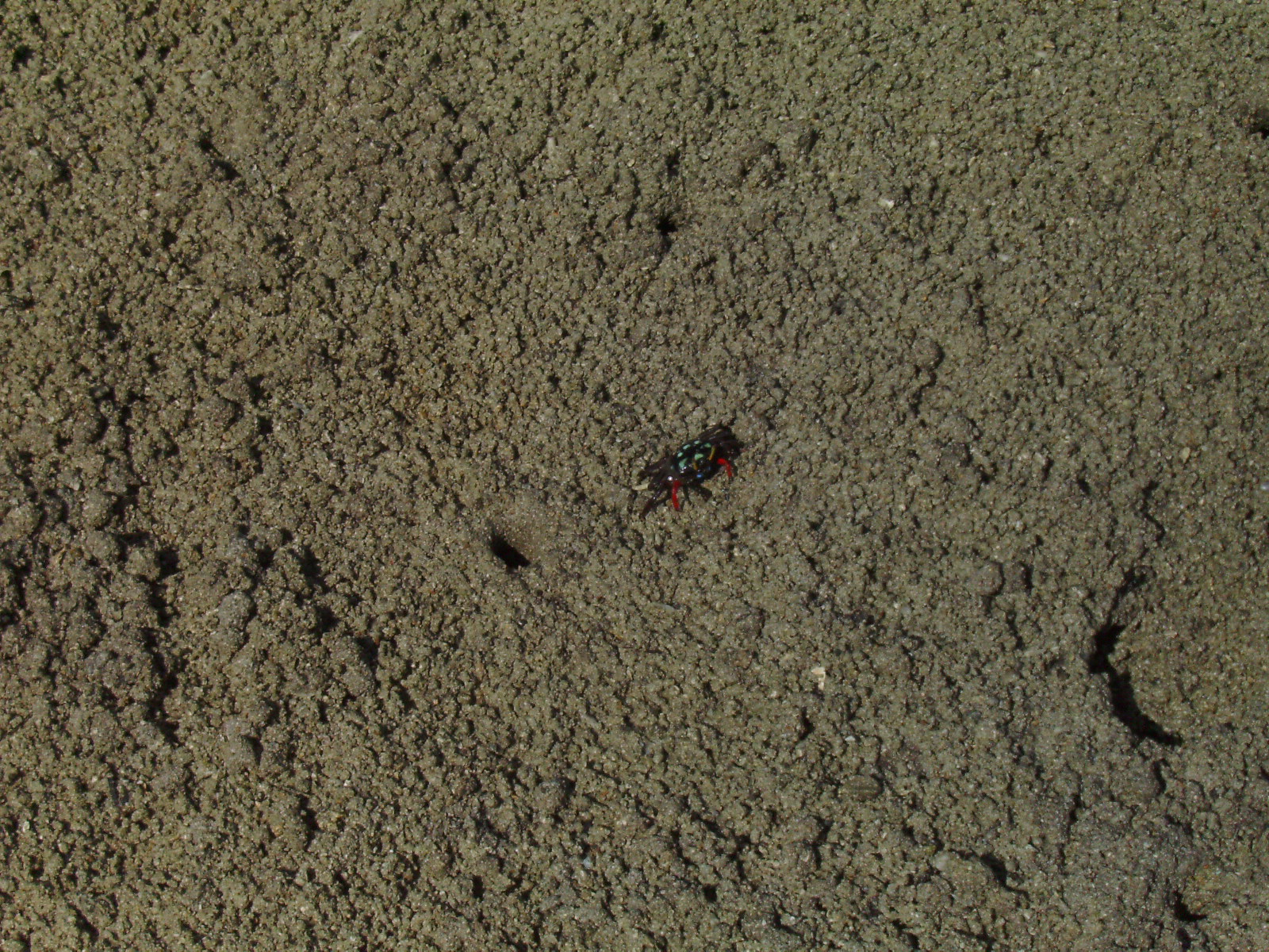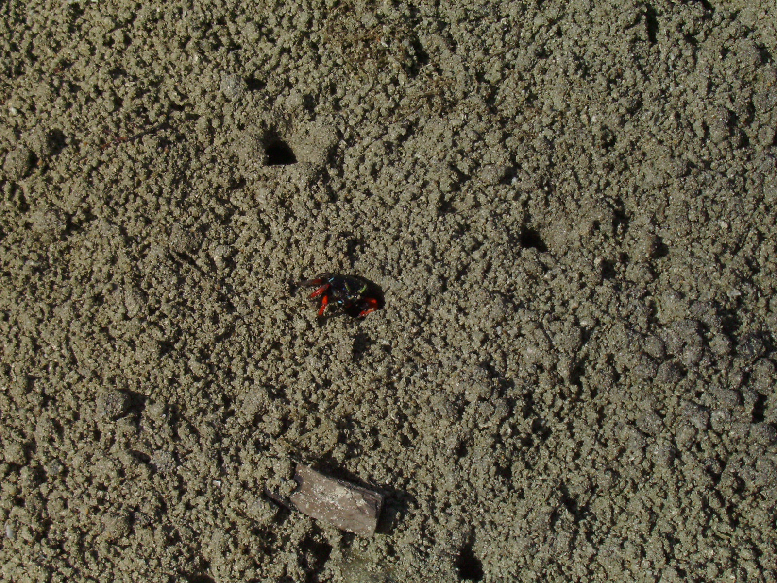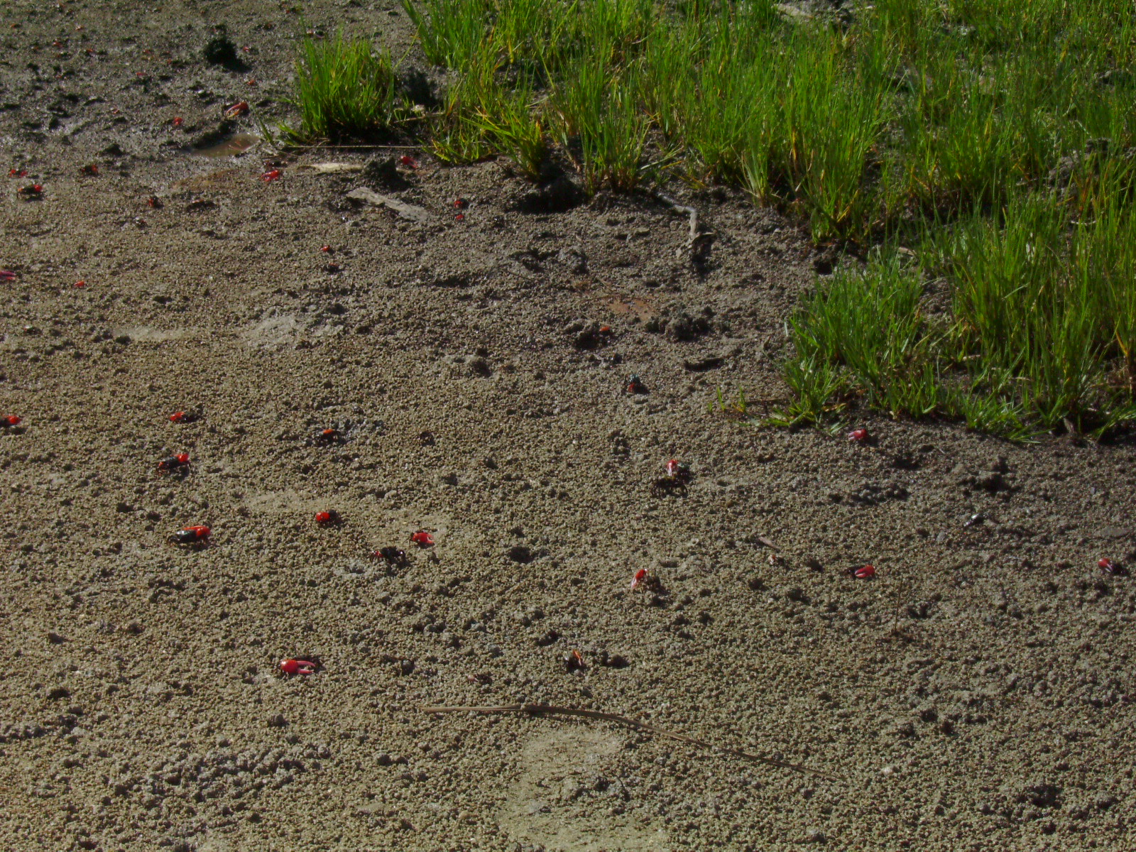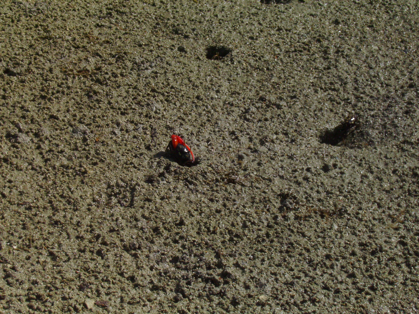D’une grande densité lorsque les conditions lui sont favorables, on peut en compter jusquà 60 au mètre carré. Prudent, ce crabe s’enfouis à faible profondeur à l’appproche de l’observateur.